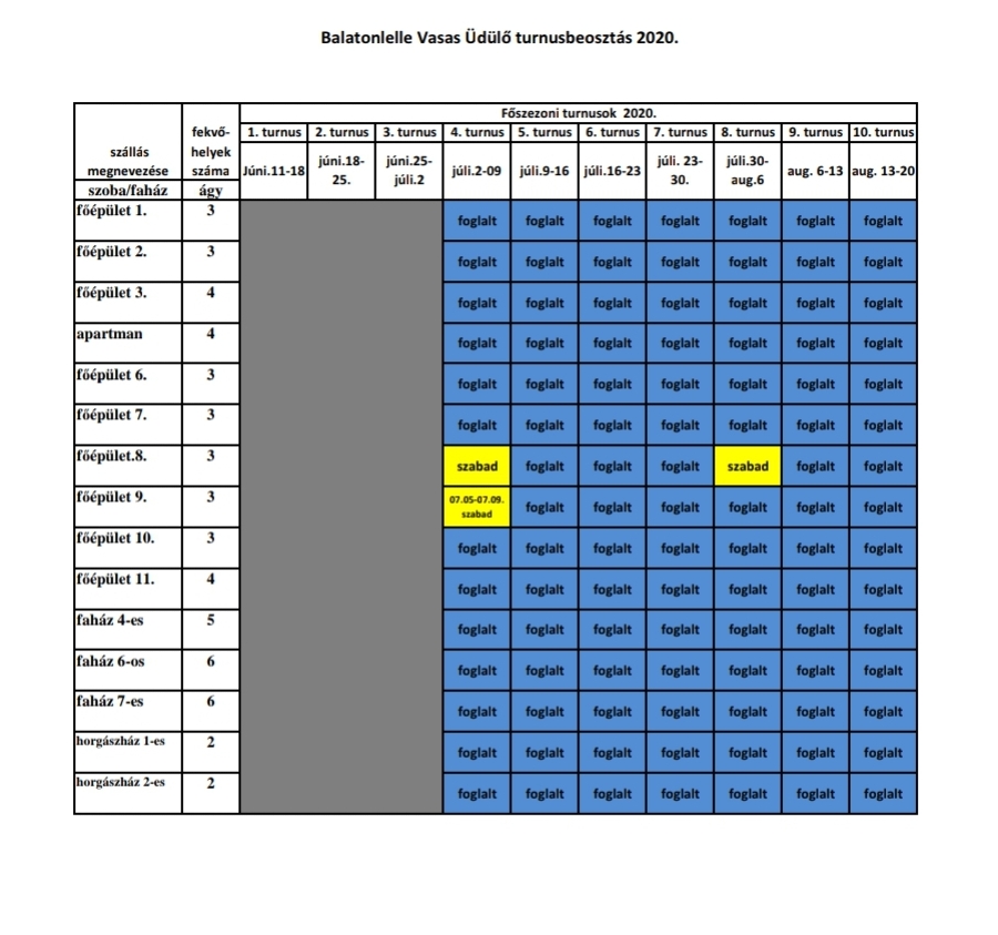 A Balatonlellei Vasas Üdülőben 2020-as évi turnusbeosztásában a szabad szobákat láthatjátok az alábbi táblázatban.
