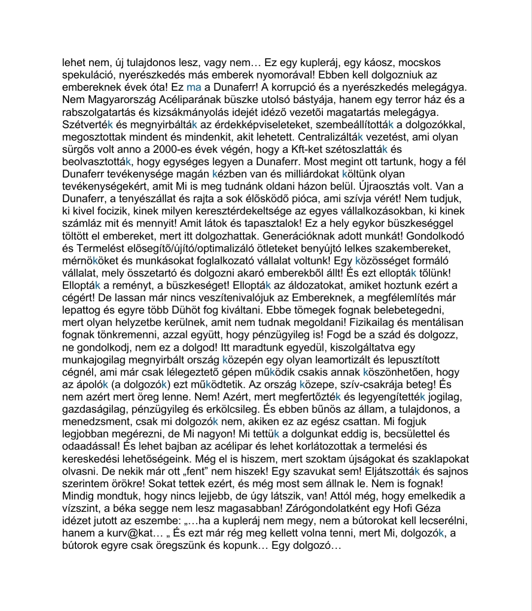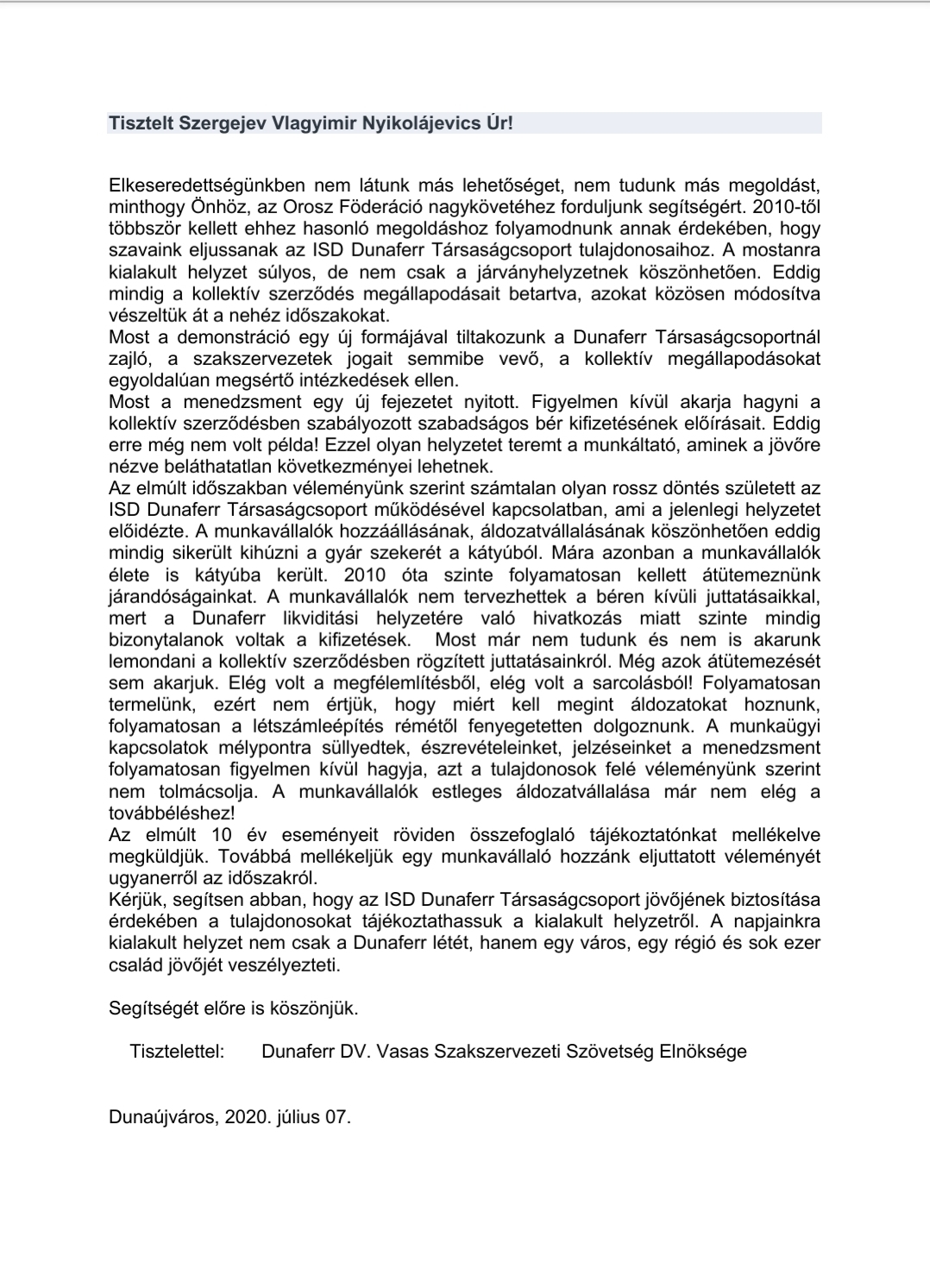 A DUNAFERR DV. Vasas Szakszervezeti Szövetség a mai napon a következő leveleket küldte meg az Orosz Föderáció nagykövetének segítségét kérve a többségi tulajdonosunkkal történő kapcsolatfelvételhez, hogy mi is el tudjuk mondani álláspontunkat a Dunaferr Társaságcsoportnál kialakult helyzetről.