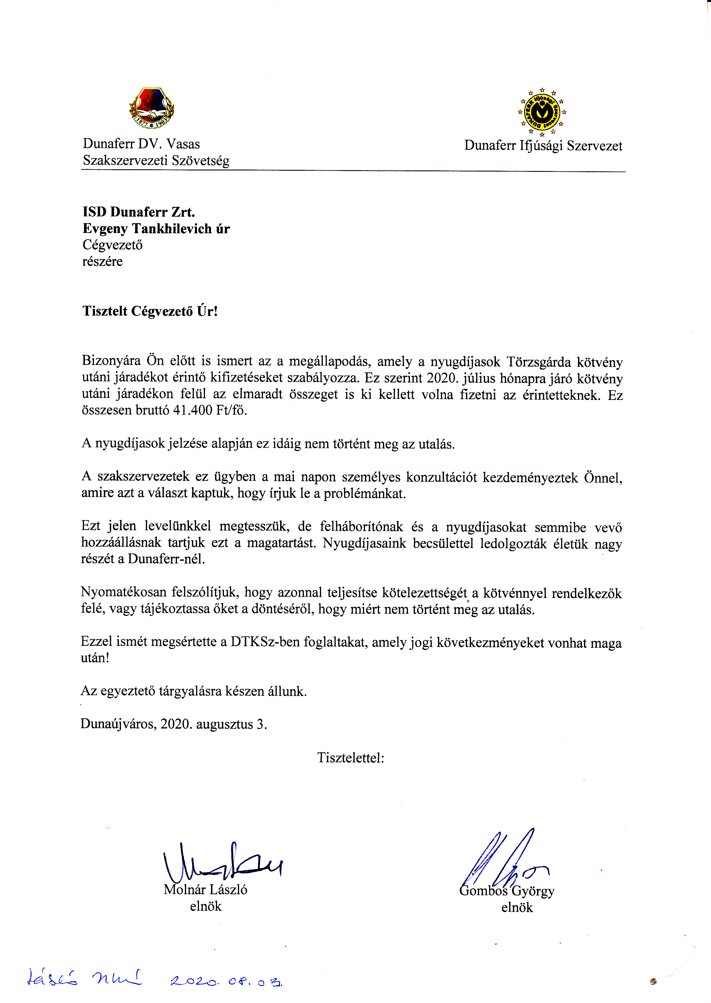 A mellékelt levelet adtuk át cégvezető úrnak a nyugdíjasok Törzsgárda kötvény után fizetendő juttatásával kapcsolatban.