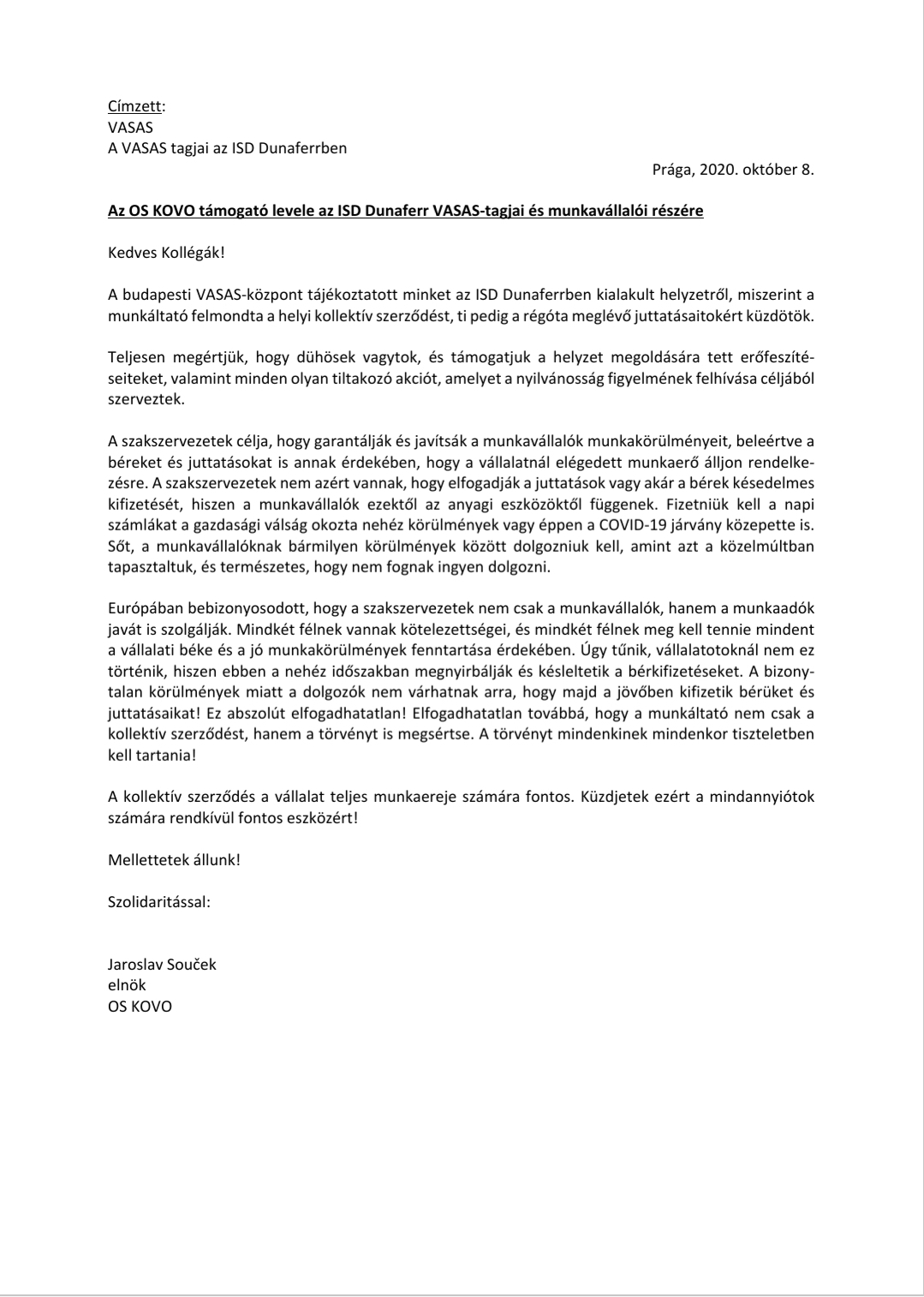 Cseh szakszervezet támogató levele Hirek 2020. október 08. Az alábbi levelet kaptuk ma az OS KOVO-tól. Az OS KOVO támogató levele a Dunaferr Vasas tagjainak és munkavállalóinak.
