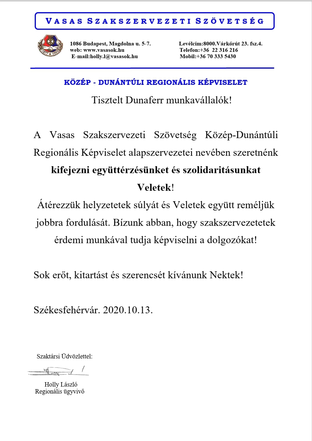 Szolidaritási levél - Közép - Dunántúli Regionális Képviselet Hirek 2020. október 14. Kedves Tagjaink!Szolidaritási levél a Közép-Dunántúli Regionális Képviselet ügyvivőjétől, Holly Lászlótól.
