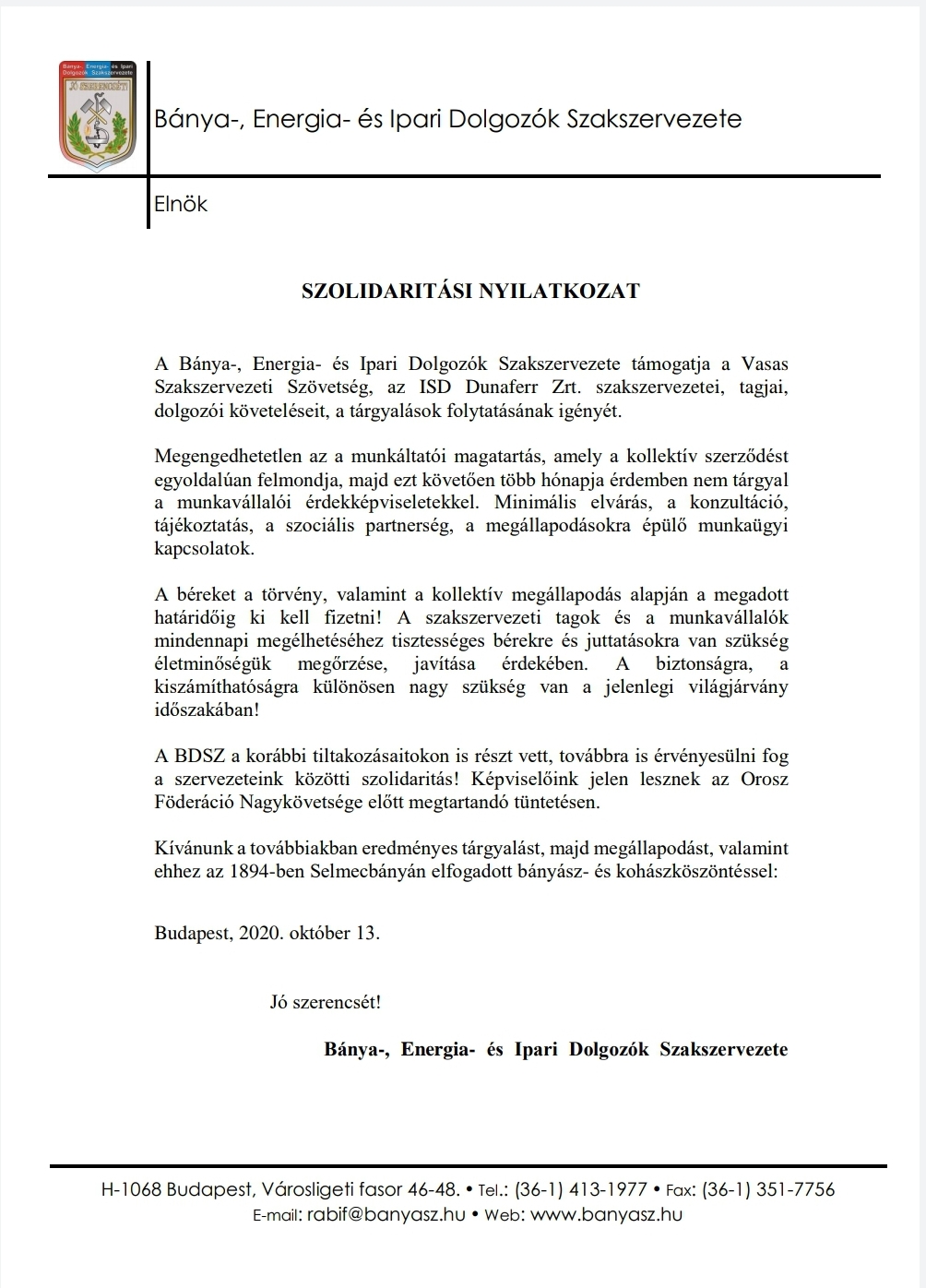 Szolidaritási levél - Bánya-, Energia- és Ipari Dolgozók Szakszervezete Hirek 2020. október 14. Kedves Tagjaink!Szolidaritási levél a Bánya-, Energia- és Ipari Dolgozók Szakszervezetétől!
