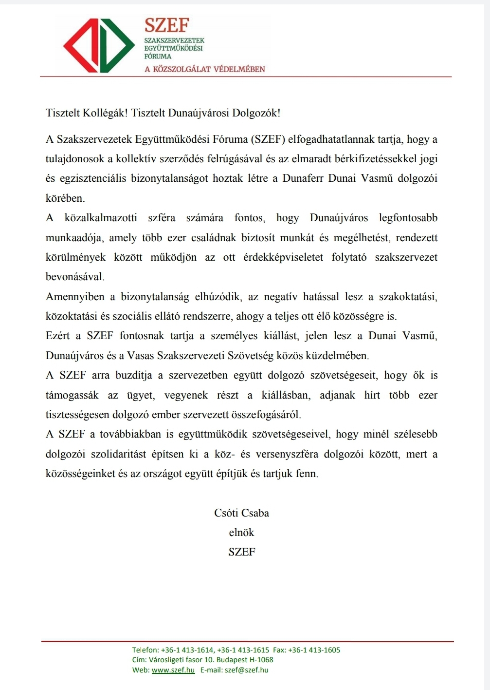 Szolidaritási levél - Szakszervezetek Együttműködési Fóruma Hirek 2020. október 14. Kedves Tagjaink!Szolidaritási levél a Szakszervezetek Együttműködési Fóruma elnökétől!