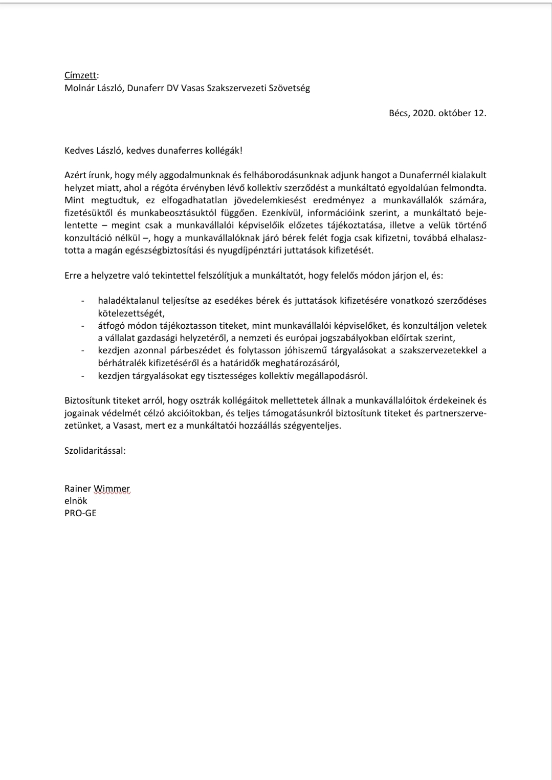 Szolidaritási levél - PRO-GE Hirek 2020. október 14. Kedves Tagjaink!Szolidaritási levél a PRO-GE elnökétől!