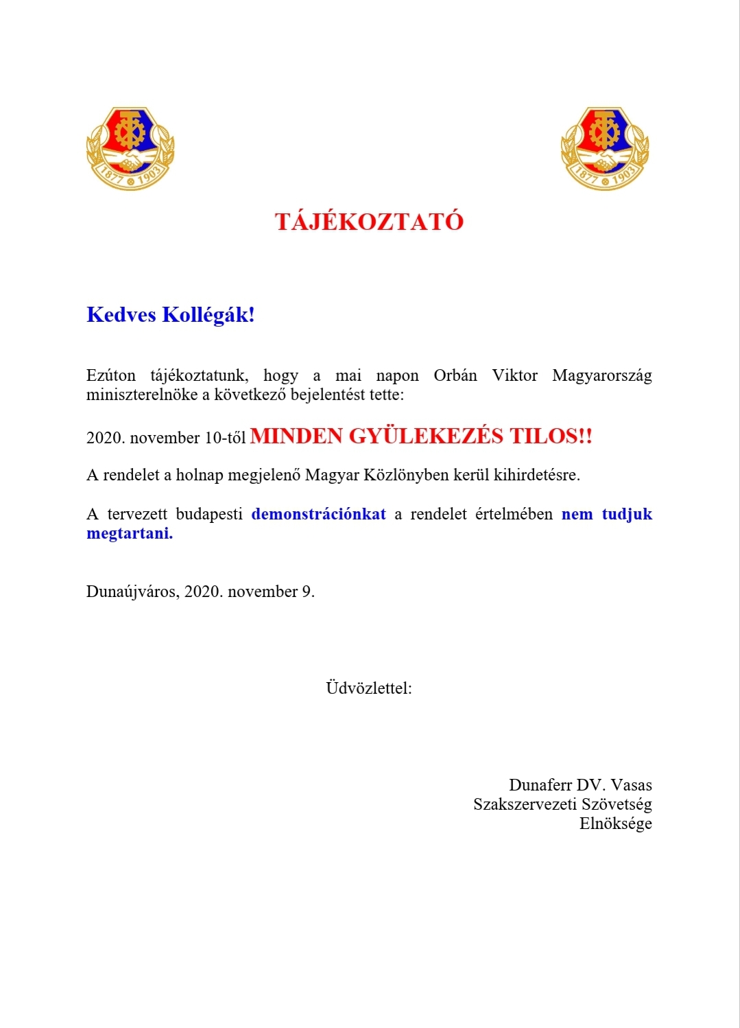 A 2020. november 10-én életbe lépő Kormányrendelet értelmében minden gyülekezés tilos ezáltal a tervezett demonstrációt nem tudjuk megtartani!