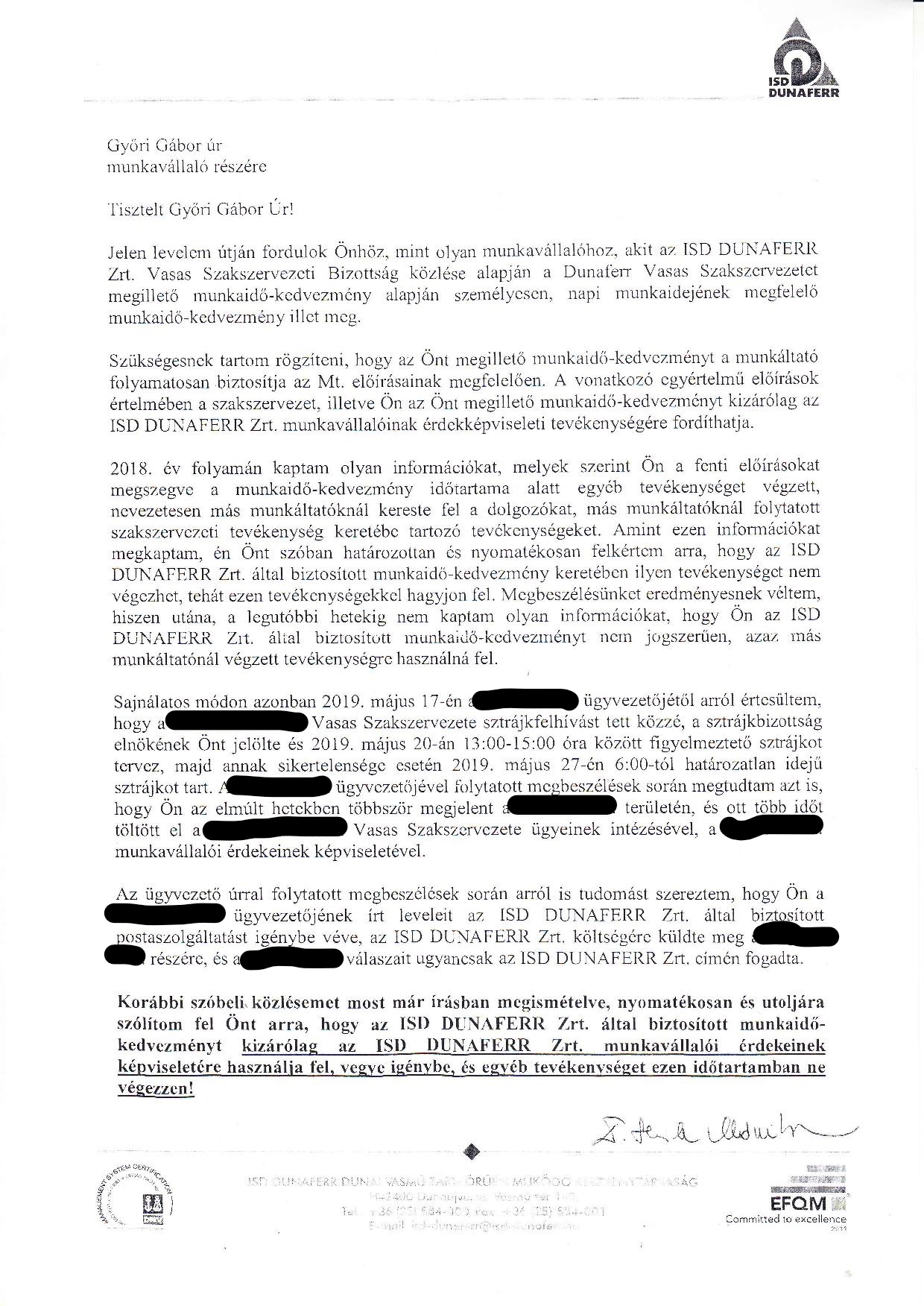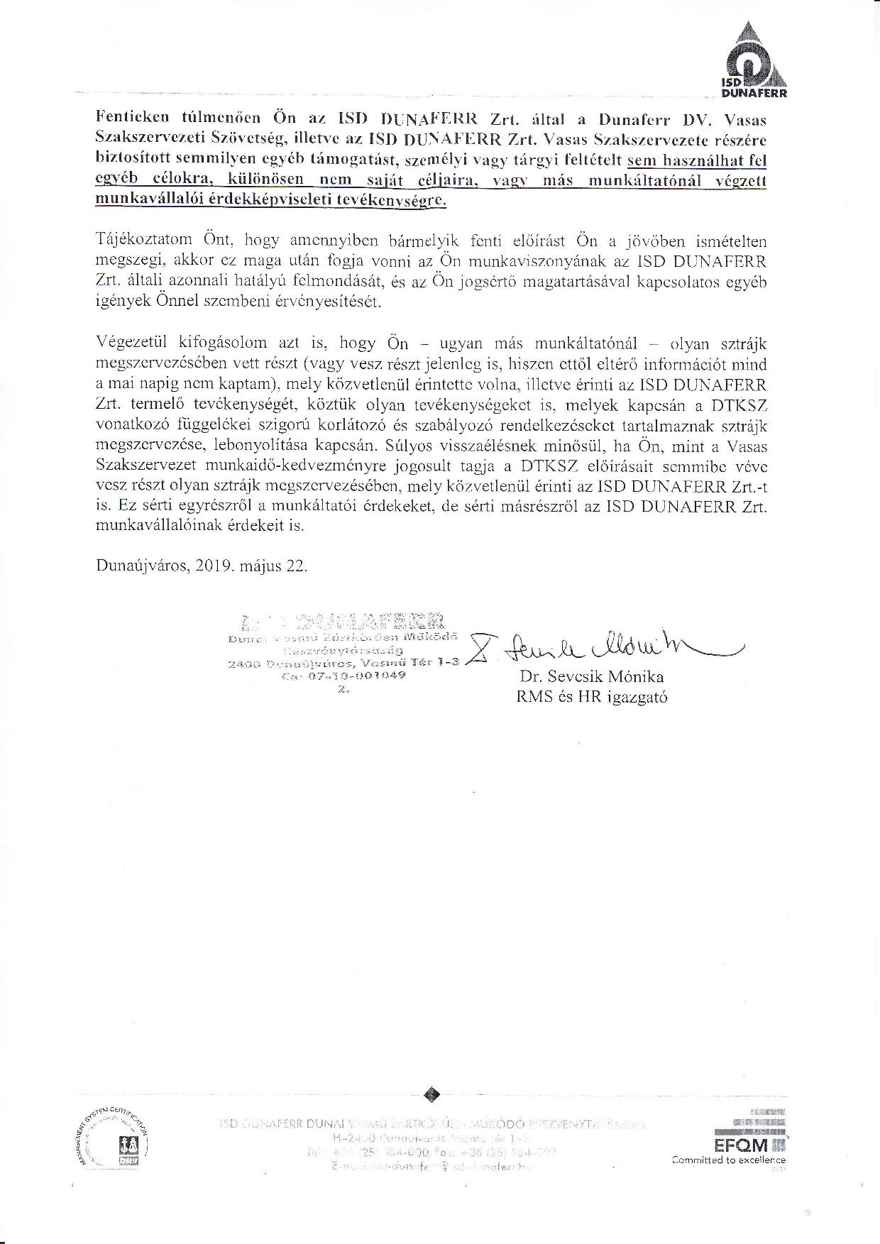 Hogy igazán korrektek legyünk a felmondólevél alatt közzéteszünk egy múltbeli levelet, melyben szintén látható az érdekvédelmi munka elnehezítését bizonyító munkáltatói nyomásgyakorlás!