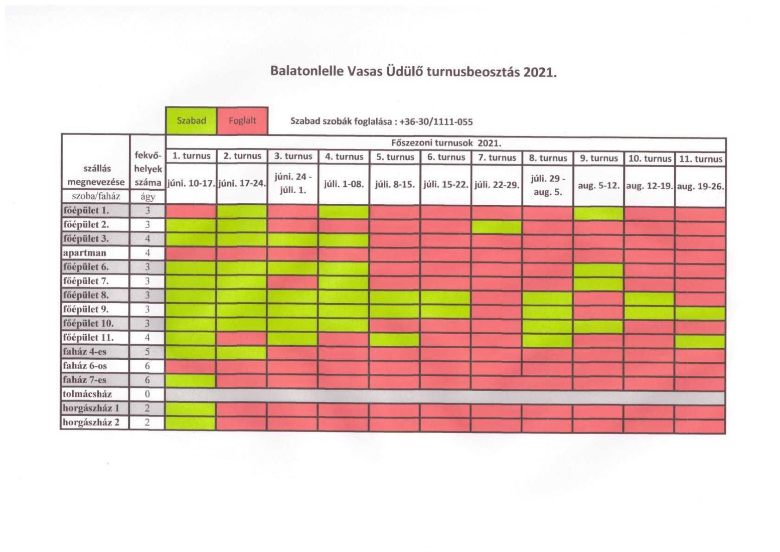 Az alábbi táblázat szabad időpontjaira még van lehetőség jelentkezni a balatonlellei üdülőnkbe. Információ és jelentkezés a 30/111-1055-ös telefonszámon, munkanapokon 7-15 óra között. A táblázatban még foglaltként szerepel, de időközben az 3. turnusban (06.24.-07.01.) a 6-os faház szabaddá vált! Ugyan ez vonatkozik a 4. turnusban (07.01-08.) a 4-es faházra, az 5. turnusban (07.08-15.) az 1-es és 2-es horgászházra, valamint a 7. turnusban (07.22-29.) az apartmanra!