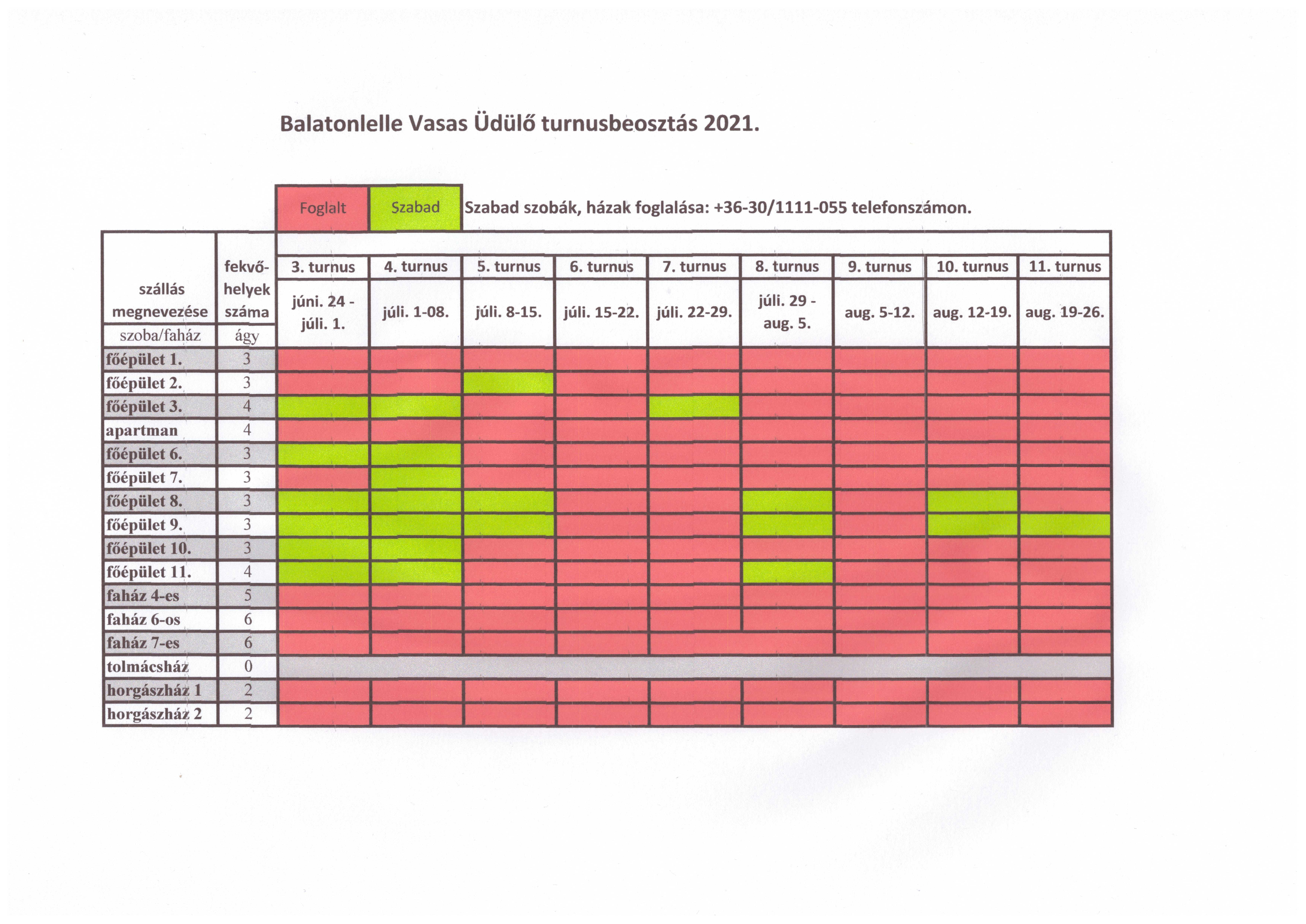 Az alábbi táblázat szabad időpontjaira van még lehetőség jelentkezni a balatonlellei üdülőnkbe. Információ és jelentkezés a 30/111-1055-ös telefonszámon, munkanapokon 7-15 óra között. Időközben a 7. turnusban (júl. 22-29.) a főépület 1-es szobája szabaddá vált!