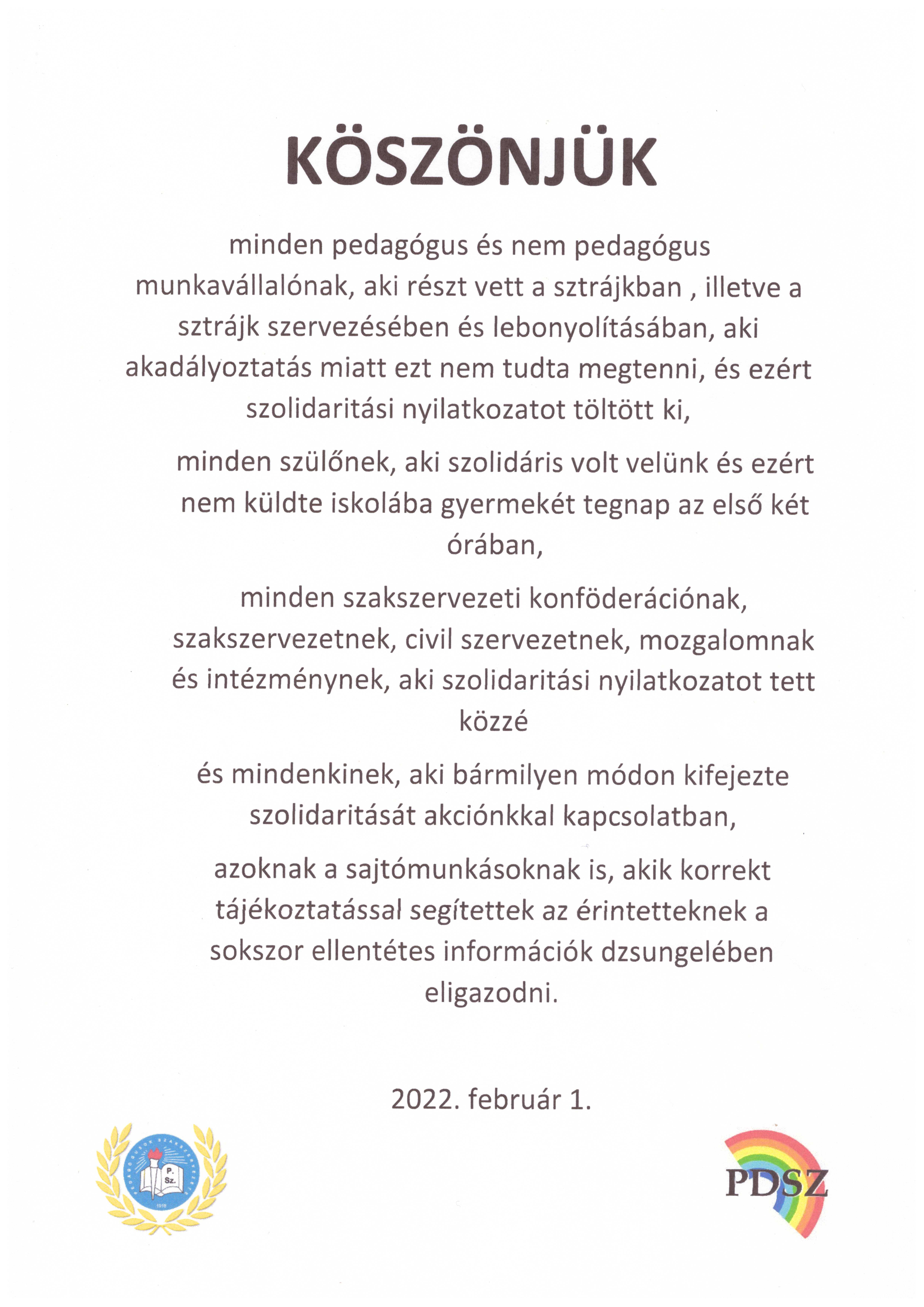 KÖSZÖNŐ LEVÉL A PEDAGÓGUS SZAKSZERVEZETEKTŐL Hirek 2022. február 04. Tisztelt Tagjaink! Az alábbi közös köszönő levelet kaptuk a PSZ és a PDSZ pedagógus szakszervezetektől.