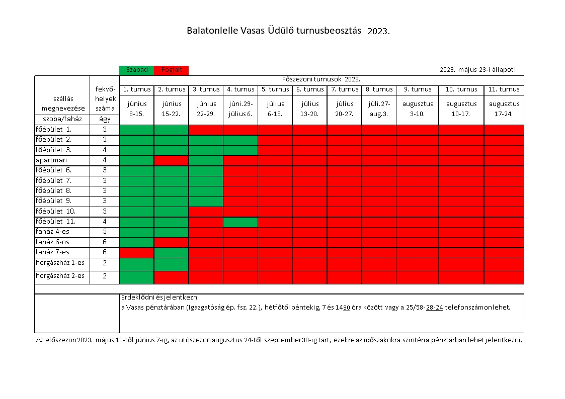 Frissítve! Az alábbi táblázat alapján lehetőség van még a szabad helyek foglalására a balatonlellei üdülőnkben. Érdeklődni és jelentkezni a Vasas pénztárában (Igazgatóság ép. fsz. 22.), hétfőtől péntekig, 700 és 1430 óra között vagy a 25/58-28-24 telefonszámon lehet. Ugyan itt lehet még az elő- és utószezoni szabad helyekre is foglalni.