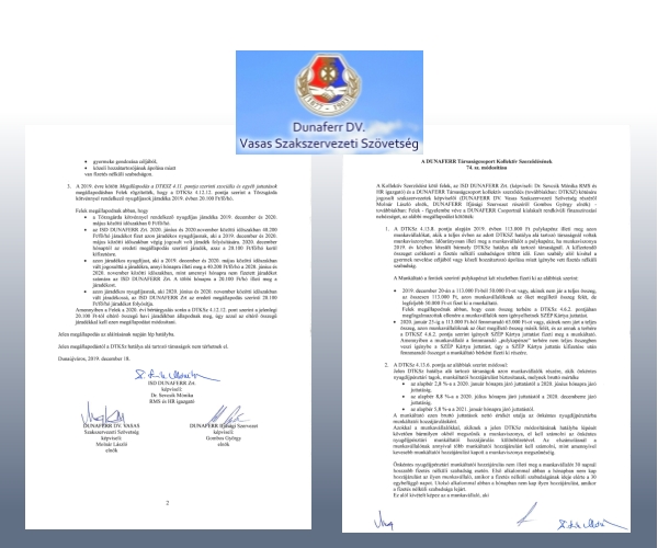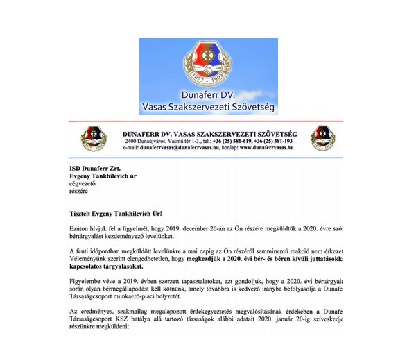 A Dunaferr DV. Vasas Szakszervezeti Szövetség ismételten levélben fordult az ISD Dunaferr Zrt vezetéséhez, hogy mielőbb megkezdődhessenek a 2020. évi bérrel és béren kívüli juttatásokkal kapcsolatos tárgyalások.